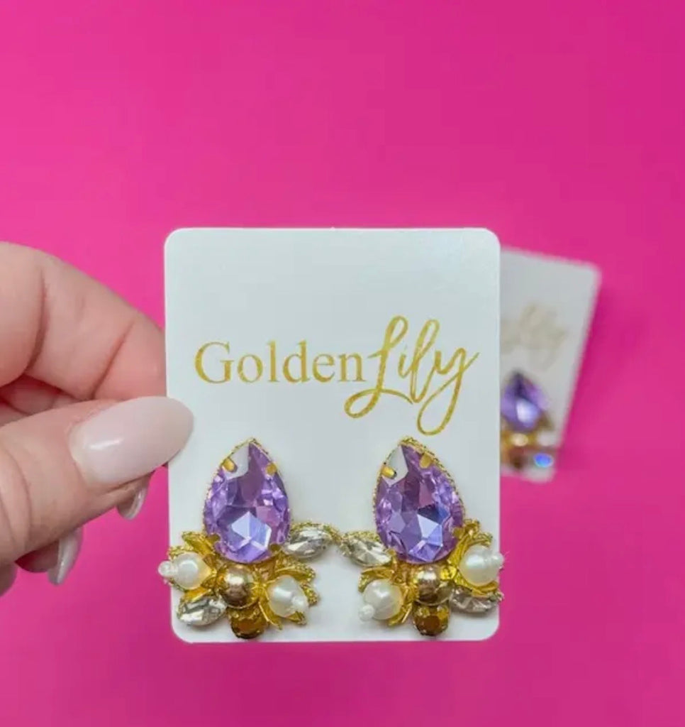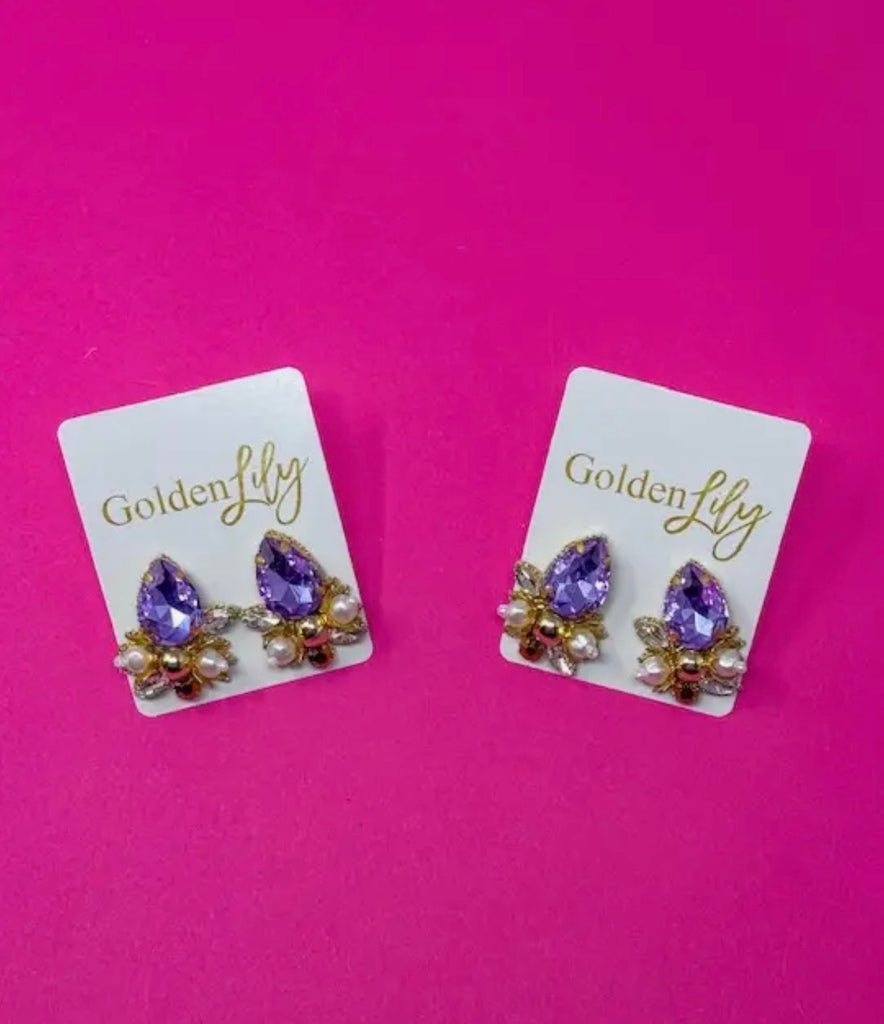 Golden Lily - Oval Rhinestone & Pearl Earrings - Purple