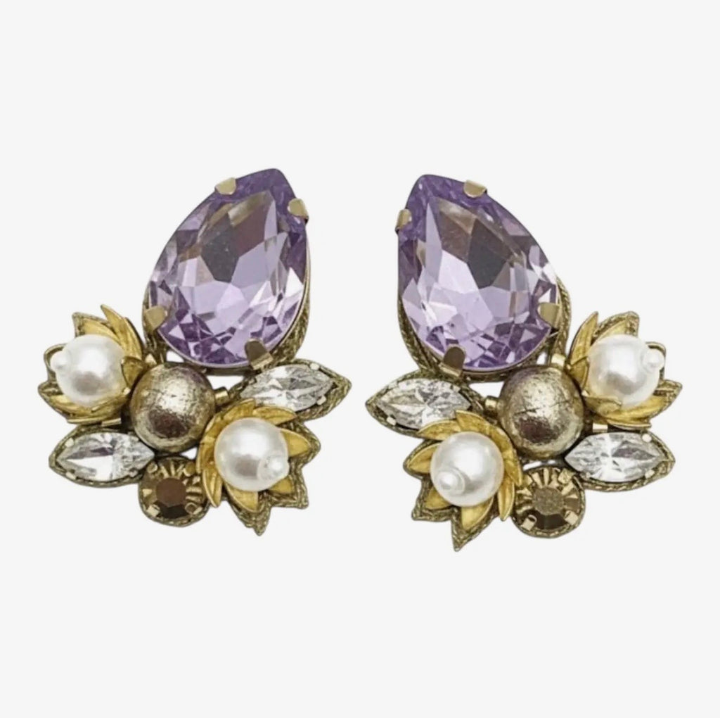 These elegant stud earrings feature a radiant burst design with a faceted purple rhinestone at the center, surrounded by shimmering clear crystals, soft gold-tone accents, and delicate pearl details. The dimensional cluster creates beautiful light-catching shine while maintaining a refined, wearable size. Romantic yet versatile, these earrings effortlessly elevate both everyday outfits and special occasion looks.