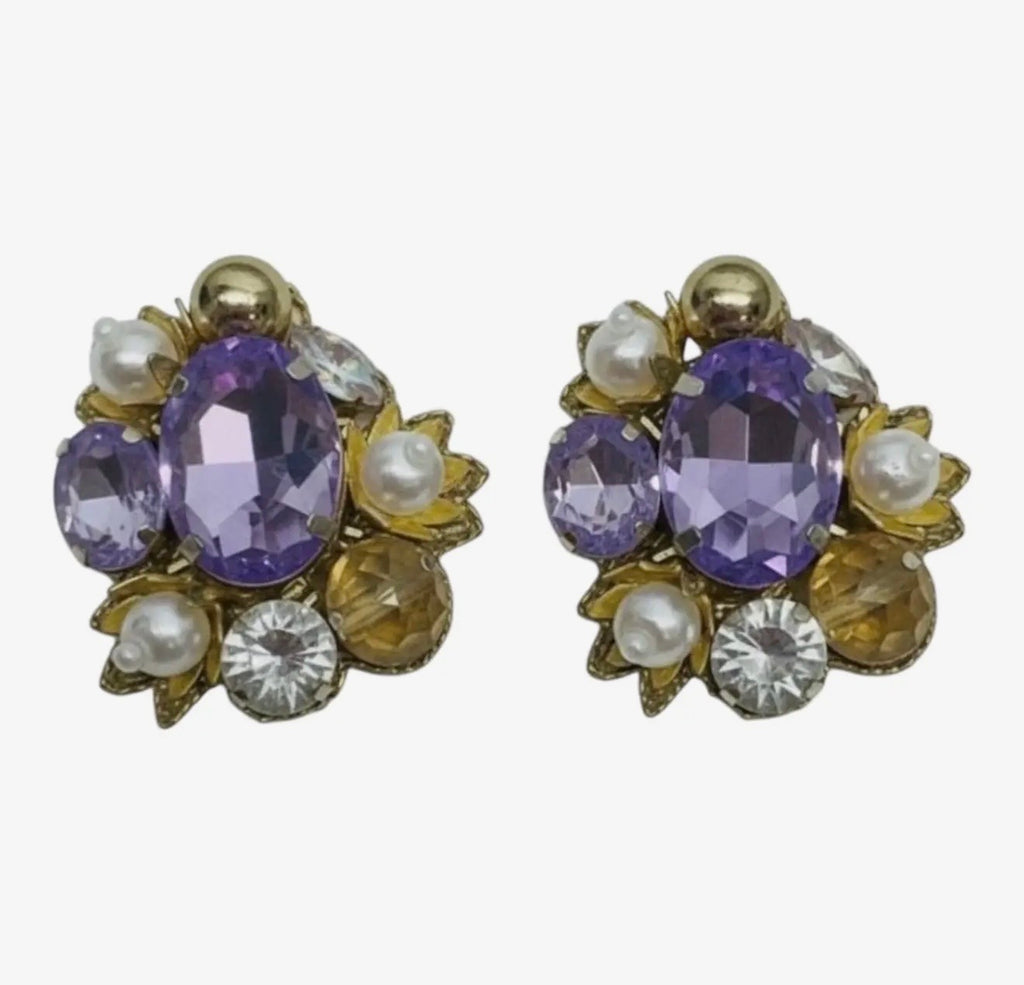 These elegant stud earrings feature a radiant burst design with a faceted lavender rhinestone at the center, surrounded by shimmering clear crystals, soft gold-tone accents, and delicate pearl details. The dimensional cluster creates beautiful light-catching shine while maintaining a refined, wearable size. Romantic yet versatile, these earrings effortlessly elevate both everyday outfits and special occasion looks.