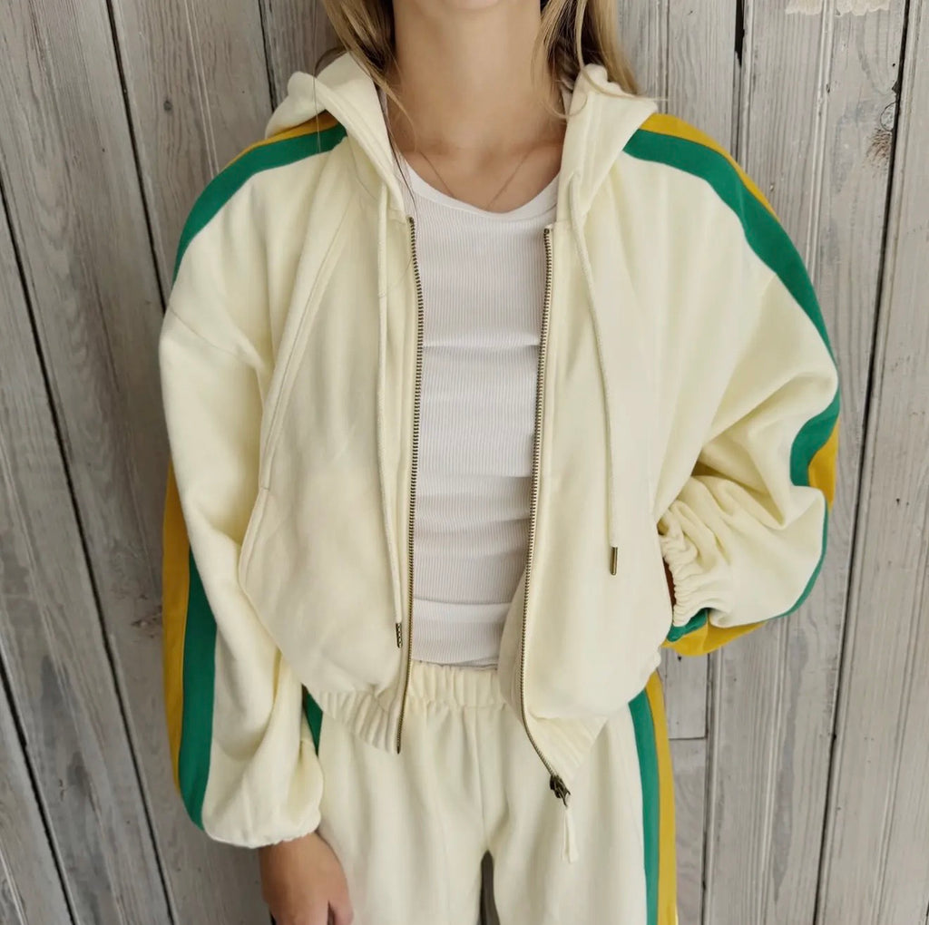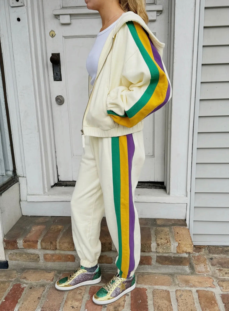 Get ready to party like it’s Fat Tuesday every day with the Mardi Gras Nation Set! This dynamic duo includes a cozy zip hoodie and joggers that scream “let the good times roll!” (or at least jog mildly). Perfect for strutting your stuff or just lounging like a king. Who says you can’t have beads and comfort? Grab yours now, and let the festivities begin!