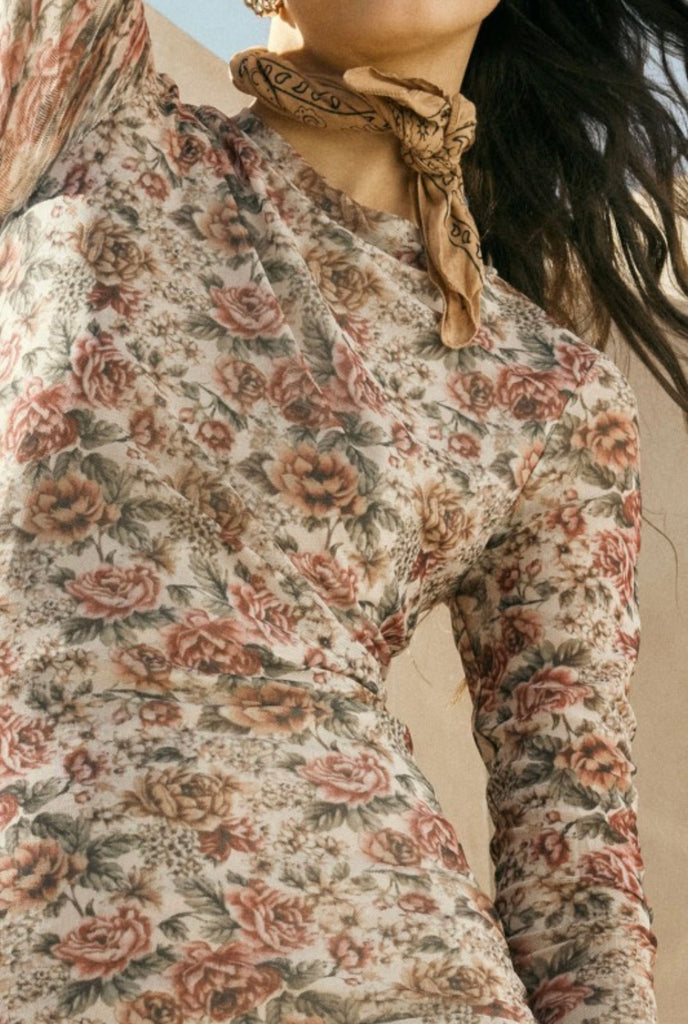 Experience the beauty and elegance of the Kennedy Floral Mesh Dress - Cream. This midi dress features a delicate floral print on sheer mesh fabric, perfect for any occasion. The high mock neckline and long sleeves add a touch of sophistication, while the fitted silhouette highlights your curves. With a partial lining and lettuce-edge finish, this dress is both comfortable and stylish. Elevate your wardrobe with this stunning calf-length dress.