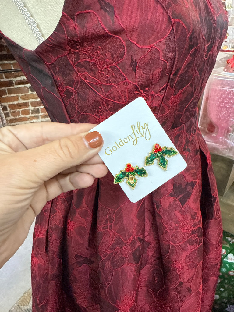 [Defect Style] Golden Lily - Christmas Holly Stud Earrings