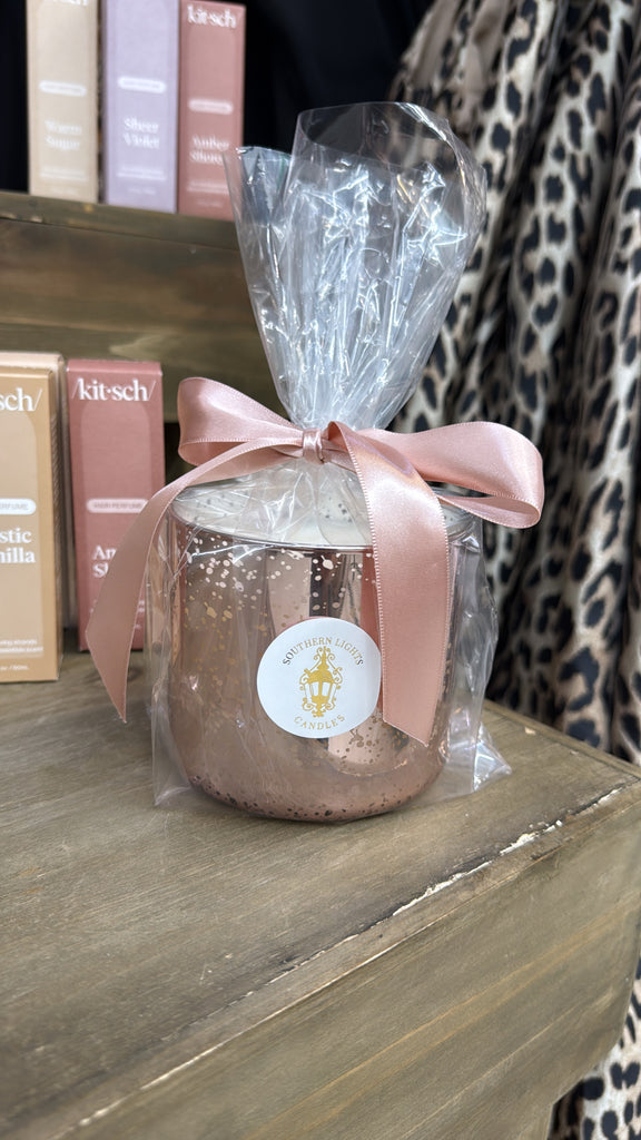 Transform any room into a cozy oasis with Southern Lights Candles. The 20 oz pink mercury glass vessel exudes elegance, while the decadent scents provide a warm and inviting atmosphere. Bring a touch of luxury and tranquility to your space with these hand-poured candles.