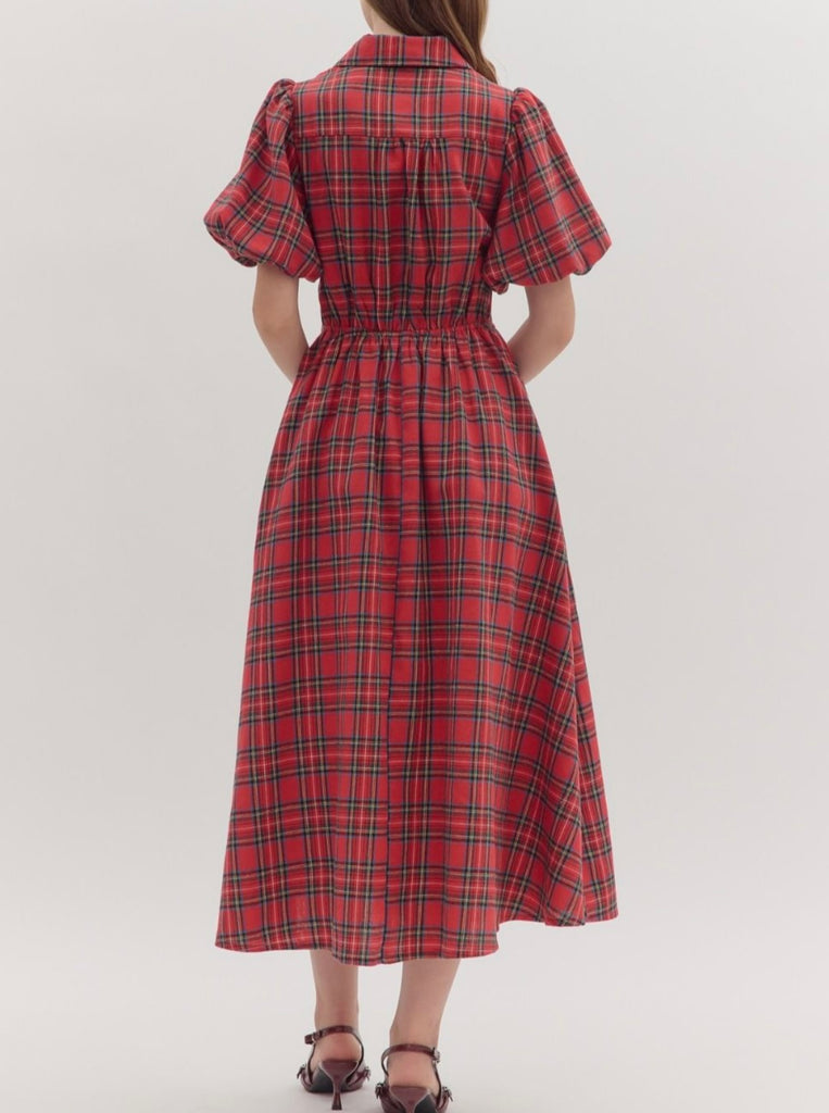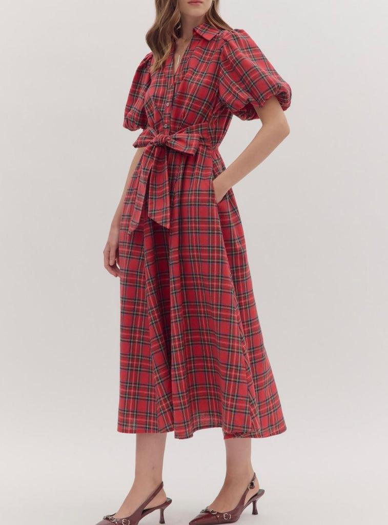 Plaid puff sleeve midi dress featuring self-tie waist belt and button closure at front. Side pockets. Lined. Woven. Non-sheer. Medium weight.