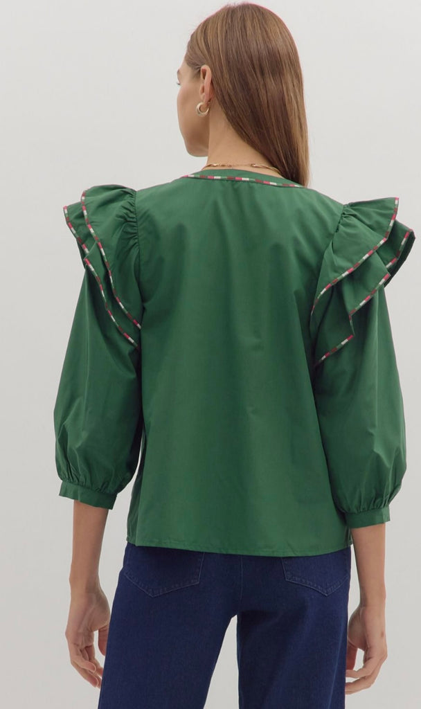 This refined Emery Puff Sleeve Top in rich green showcases a structured 3/4 length sleeve adorned with elegant layered ruffles and a striking multicolor contrast trim. The V-neckline enhances its graceful silhouette, while the lightweight woven fabric ensures comfortable wear without sheerness. Unlined for ease, this top seamlessly combines sophistication with subtle detail, perfect for elevating your wardrobe with understated charm.